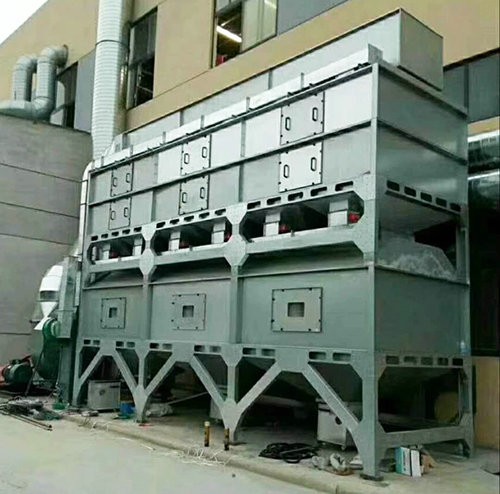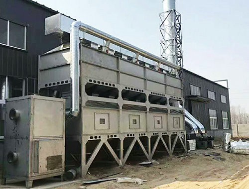 在化學(xué)反應(yīng)過程中,利用催化劑降低燃燒溫度,加速有毒有害氣體完全氧化的方法,叫做催化燃燒法。由于催化劑的載體是由多孔材料制作的,具有較大的比表面積和合適的孔徑,當(dāng)加熱到300~450℃的有機(jī)氣體通過催化層時,氧和有機(jī)氣體被吸附在多孔材料表層的催化劑上,增加了氧和有機(jī)氣體接觸碰撞的機(jī)會,提高了活性,使有機(jī)氣體與氧產(chǎn)生劇烈的化學(xué)反應(yīng)而生成CO2和H2O,同時產(chǎn)生熱量,從而使得有機(jī)氣體變成無毒無害氣體。